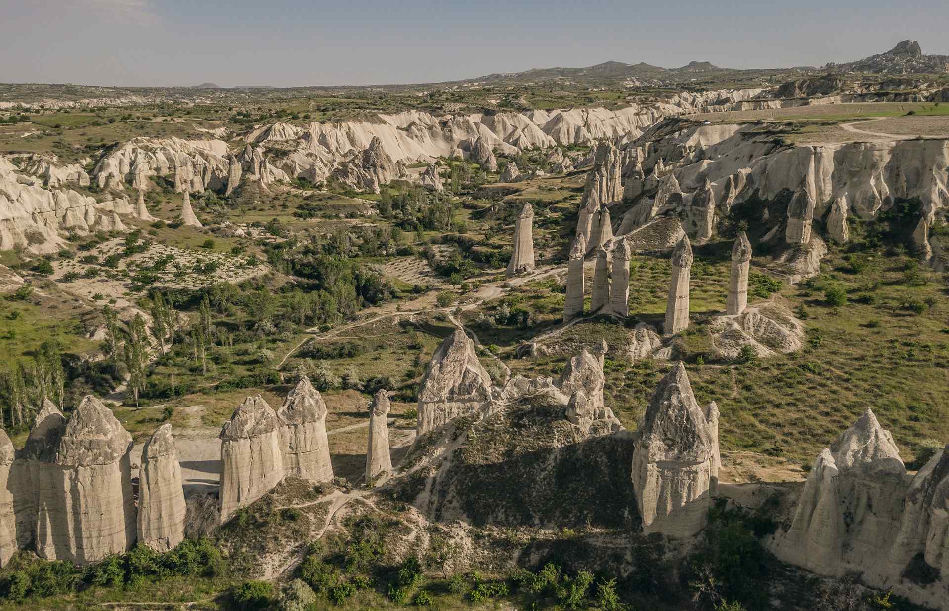 The fairy chimneys were formed by a combination of volcanic activity, wind, and water erosion over millions of years. The volcanic ash and lava that covered the region millions of years ago have since been eroded by the elements, leaving behind the cone-shaped formations that we see today.